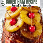 A deliciously glazed baked ham featuring a sweet and tangy pineapple and brown sugar glaze, perfect for holiday meals or special occasions. The ham is tender and infused with warm spices, adorned with pineapple slices and maraschino cherries for a classic presentation.