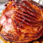 A deliciously glazed baked ham featuring a sweet and tangy pineapple and brown sugar glaze, perfect for holiday meals or special occasions. The ham is tender and infused with warm spices, adorned with pineapple slices and maraschino cherries for a classic presentation.