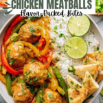 These Basil Ginger Meatballs in Coconut Red Curry Sauce are a flavorful and aromatic dish combining tender ground chicken meatballs infused with fresh and dried basil, ginger, and spices, simmered in a rich coconut red curry sauce with bell peppers, green beans, and a hint of lime. Served over jasmine rice, this recipe offers a comforting and exotic meal perfect for dinner.