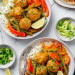 - Serve: Serve meatballs and coconut red curry sauce over fluffy jasmine rice. Garnish with chopped scallions and/or fresh cilantro and lime wedges for squeezing if desired. Optionally serve with naan or pita bread for dipping.