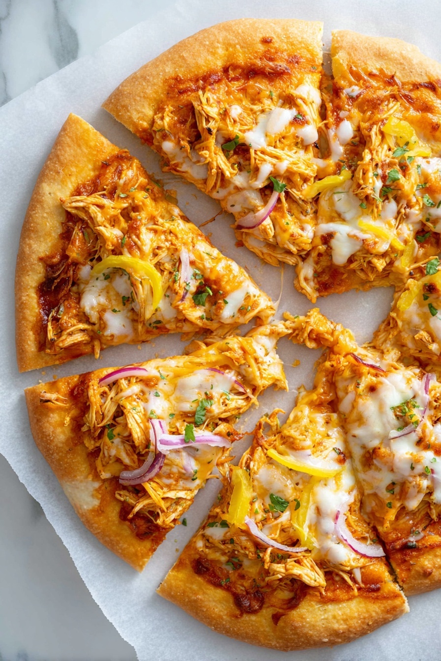 Delicious Buffalo Chicken Pizza with a crispy garlic butter parmesan crust, topped with shredded buffalo chicken, mozzarella, red onions, and banana peppers, finished with blue cheese dressing and flavorful garnishes. Perfect for a spicy, savory main course that satisfies pizza and buffalo wing cravings alike.