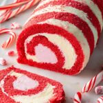 This Candy Cane Roll is a festive and colorful dessert perfect for the holiday season. Featuring a light peppermint-flavored sponge cake with red and white stripes baked in a spiral roll, it is filled and frosted with a creamy peppermint cream cheese frosting studded with crushed candy canes for a delightful crunch.