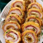 Chicken Cordon Bleu is a classic dish featuring tender chicken breasts stuffed with black forest ham and Swiss cheese, coated in a crispy panko and Parmesan breadcrumb crust, then baked to perfection and served with a creamy, tangy Dijon honey mustard sauce.