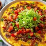This Cheeseburger Pie is a savory, hearty dish featuring a flavorful ground beef and bacon filling topped with melted cheddar cheese and a tender batter crust. Perfect for a comforting main course, it combines all the best elements of a cheeseburger in a convenient, sliceable pie.