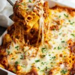 A hearty and cheesy baked pasta casserole combining tender pasta, ricotta, mozzarella, and a savory meat marinara sauce, perfect for a comforting family meal.