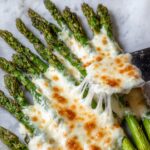 Once roasted, sprinkle a generous cup of shredded mozzarella over the asparagus. Switch your oven to the broil setting on high and pop the pan back in for just 2–3 minutes. Keep your eyes glued here! You want the cheese melted and bubbly, maybe with a few golden brown spots, but not burnt.