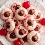 Cherry Blossom Cookies are delightful, soft, buttery treats infused with maraschino cherry juice and almond extract, featuring a bright pop of chopped maraschino cherries and crowned with a Hershey’s Kiss for a perfect balance of flavor and charm. These cookies bake quickly to a lightly golden finish and are coated in sweet granulated sugar, making them as visually appealing as they are delicious.
