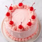 Cherry Chip Cake is a delightful white cake enhanced with chopped maraschino cherries and cherry juice for a burst of fruity flavor. Topped with a creamy cherry buttercream frosting and garnished with whole cherries, this cake is perfect for celebrations or any sweet treat occasion.