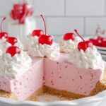 This Cherry Kool-Aid Pie is a no-bake, easy-to-make, and refreshing dessert perfect for hot summer days. Combining a pre-made graham cracker crust with a creamy filling flavored with unsweetened black cherry Kool-Aid and topped with cool whip and maraschino cherries, this pie serves 8 and requires minimal prep time with a chilling period to set.