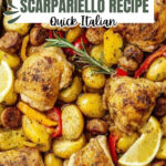 Chicken Scarpariello is a flavorful Italian-American dish featuring bone-in chicken thighs and Italian sausage roasted with crispy potatoes and a tangy, spicy sauce made from pickled cherry peppers, white wine, and fresh herbs. The chicken is seared before roasting to develop a golden crust, then baked together with the sauce and potatoes for a delicious, comforting meal perfect for dinner.