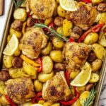 - Combine on baking sheet: Transfer the seared chicken, browned sausage, and the sauce mixture onto the baking sheet with the roasted potatoes. Spread everything out evenly for uniform cooking.