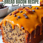 - Prepare Glaze and Assemble: In a small bowl, whisk together peanut butter, honey, and powdered sugar until smooth. Pour the glaze over the cooled bread, then sprinkle with candied bacon pieces and additional chocolate chips for garnish.