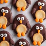 - Attach Eyes and Nose: Place two candy eyes on the top half of the cookie for eyes. Press half of an orange Reese’s piece, cut side down, underneath the eyes for the penguin’s nose.