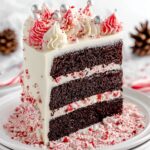 A festive and rich Chocolate Peppermint Cake featuring moist cocoa layers paired with a smooth Peppermint Swiss Meringue Buttercream, decorated with crushed candy canes and piped red and white frosting for a holiday treat.
