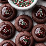Delicious Chocolate Thumbprint Cookies with a rich cocoa-flavored cookie base, filled with smooth chocolate ganache and optionally topped with colorful nonpareils. These cookies are perfect for chocolate lovers and make a sophisticated treat for any occasion.