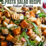 A festive and flavorful Christmas Pasta Salad featuring roasted cinnamon sweet potatoes, colorful Christmas-shaped pasta, crisp apples, creamy white cheddar, dried cranberries, walnuts, and fresh arugula, all tossed in a tangy maple balsamic dressing perfect for holiday gatherings.