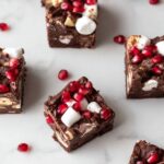Christmas Rocky Road is a festive, no-bake dessert featuring a rich blend of melted semi-sweet chocolate, almond butter, roasted almonds, dried cranberries, mini marshmallows, and fresh pomegranate seeds, spiced with a hint of vanilla, ginger, cinnamon, and allspice. This easy-to-make treat is perfect for holiday celebrations, combining sweet, tart, and nutty flavors in each bite.