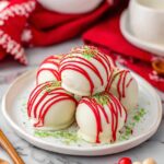 - Drizzle Red Candy Melt: Transfer melted candy melts to a storage bag and cut a small corner. Drizzle the red candy melts over the coated cake balls back and forth for decoration.