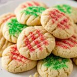 - Shape and decorate cookies: Scoop balls of dough onto the prepared baking sheet, spacing them at least 1 inch apart. Using a fork, gently press a criss-cross pattern into each cookie. Sprinkle with red and green sanding sugar.
