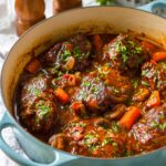 Coq au Vin is a classic French dish featuring tender chicken thighs braised in a rich red wine sauce with bacon, mushrooms, carrots, and fresh herbs, resulting in a deeply flavorful and comforting meal perfect for dinner.