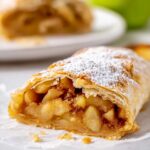Traditional German Apple Strudel (Apfelstrudel) featuring a thin, flaky dough wrapped around a spiced apple and raisin filling, baked to golden perfection and dusted with powdered sugar for a classic dessert.