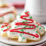 This copycat recipe recreates the festive Little Debbie Christmas Tree Cakes, featuring fluffy yellow cake layers filled with a creamy marshmallow frosting and coated in smooth white almond bark. These delightful holiday treats are decorated with green sanding sugar and red candy melt stripes, perfect for seasonal celebrations.