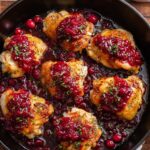 This Cranberry Orange Chicken recipe features tender, juicy boneless skinless chicken thighs cooked to perfection in a skillet and topped with a vibrant, tangy cranberry orange sauce made from fresh cranberries, orange juice, and a hint of maple syrup and brown sugar. A perfect dish to brighten your dinner table with a balance of sweet and savory flavors, garnished with fresh orange slices for an elegant finish.