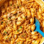 - Combine pasta and sauce: Add the drained pasta to the skillet and stir well to coat the shells evenly with the creamy beef sauce.