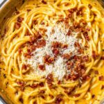 This creamy butternut squash pasta combines roasted butternut squash, garlic, and onions blended into a smooth sauce infused with Italian seasoning and nutmeg. Crispy pancetta adds a savory contrast, while spaghetti or bucatini pasta creates a hearty base. Garnished with Parmesan cheese and parsley, this comforting dish is perfect for a cozy dinner.