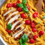 A delicious Caprese Pasta recipe featuring tender Italian-seasoned chicken, a creamy tomato and garlic sauce, fresh cherry tomatoes, and melty mozzarella cubes, tossed with penne pasta and garnished with fresh basil. Perfect for a comforting and flavorful dinner.