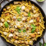 Creamy Chicken and Corn Pasta is a flavorful and comforting dish featuring tender chicken chunks sautéed with sweet corn and shallots, tossed with pasta and a rich sauce made from pesto, parmesan cheese, and cream. Perfect for a quick and satisfying weeknight dinner.