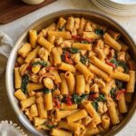 This Creamy Tomato Pesto Pasta with Chicken is a delightful blend of tender rigatoni tossed in a rich tomato and pesto cream sauce, studded with juicy chicken, sun-dried tomatoes, roasted red peppers, and fresh spinach, finished with luscious burrata cheese for a decadent touch.