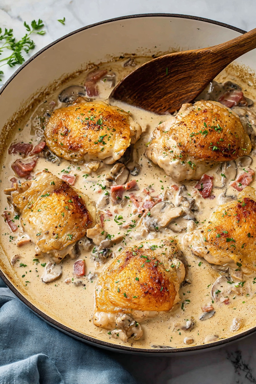 - Simmer Chicken and Bacon: Return the chicken thighs and cooked bacon to the pan. Reduce the heat to low, cover, and simmer for 25 to 30 minutes until the chicken is tender and the sauce has thickened.