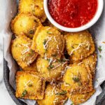 - If you don’t have an air fryer, you can bake the ravioli at 400 degrees for 10-15 minutes, flipping halfway through, until golden.