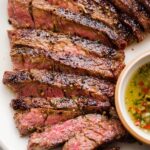 - Slice and Serve: After resting, slice the steak into ½ inch strips against the grain. Arrange the slices on a serving platter and spoon fresh chimichurri sauce over the top. Serve additional chimichurri on the side.