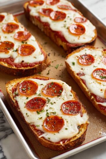- Add Toppings: Remove the baking sheet from the oven. Spread pizza sauce over each slice, then sprinkle the shredded mozzarella cheese, and arrange pepperoni slices or your preferred toppings on top.