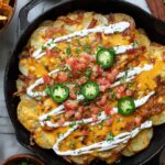 - Assemble nachos: Remove the crispy potatoes from the oven and combine them onto one baking sheet. Sprinkle shredded cheddar cheese and crumbled bacon evenly over the potatoes.
