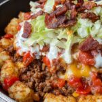 Loaded Tater Tot Nacho Casserole is a hearty and flavorful dish layering crispy baked tater tots with seasoned ground beef, sautéed peppers and onions, crispy bacon, and melted cheese. This easy-to-make casserole combines classic nacho ingredients with crispy tots for a fun twist perfect for family dinners or game day snacks.