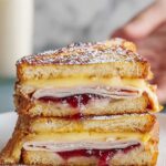 A classic Monte Cristo Sandwich combining layers of Swiss cheese, ham, turkey, and a touch of Dijon mustard, beautifully encased in buttery brioche bread, then dipped in a spiced egg batter and pan-fried to golden perfection. Finished with a dusting of confectioner’s sugar and served with warm red currant jelly, this indulgent sandwich balances savory and sweet in every bite.