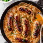 - Serve: Plate the sausages over prepared mashed potatoes, ladle the onion gravy over the top, and serve with peas on the side.