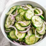 A refreshing and tangy cucumber salad featuring thinly sliced English cucumbers and red onion tossed in a zesty apple cider vinegar dressing with olive oil, honey, garlic, dill, and fresh parsley. Perfect for a light side dish or a cool appetizer.