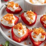 Deviled Strawberries are a delightful and elegant appetizer featuring fresh strawberries filled with a creamy, sweetened cream cheese mixture and topped with a crunchy golden Oreo and strawberry gelatin crumble. Perfect for parties and gatherings, these bite-sized treats combine creamy, fruity, and crunchy textures in a visually stunning presentation.