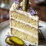 This Dill Pickle Birthday Layer Cake is a unique and savory twist on the traditional birthday cake, featuring moist layers infused with dill pickle brine and chopped sweet dill pickles. Topped with a creamy cream cheese pickle frosting and garnished with crunchy dill pickle potato chips, candied pickles, and fresh dill sprigs, this cake offers a delightful balance of tangy, sweet, and savory flavors perfect for an adventurous palate.