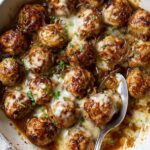 Delicious French Onion Chicken Meatballs combine tender ground chicken with melty Gruyère cheese, baked to perfection and served in a rich, caramelized onion and thyme sauce. This comforting dish is perfect for a flavorful dinner that pairs the classic French onion soup flavors with juicy chicken meatballs.