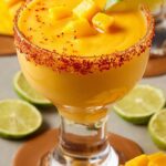 A refreshing Christmas Frozen Mango Margarita made with frozen mango chunks, blanco tequila, fresh lime juice, and a touch of sweetener, blended to a smooth, icy perfection. Perfectly rimmed with Tajín seasoning and garnished with lime or mango slices for a festive holiday treat.