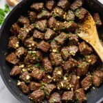 - Garnish and serve: Transfer the garlic butter steak bites to a serving plate. Garnish with chopped green onions for added flavor and visual appeal. Serve immediately to enjoy hot and juicy steak bites.