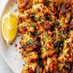 - Serve: After cooking all batches, pour the accumulated garlic parmesan butter from the air fryer over the cooked chicken skewers. Garnish with freshly chopped parsley and serve with lemon wedges for a bright finishing touch. Enjoy!