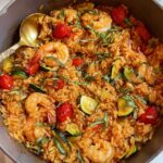 - Add Tomatoes and Shrimp: Stir in the halved cherry tomatoes and peeled, deveined shrimp. Continue cooking uncovered for 4 minutes until the shrimp turns opaque and the rice is tender.