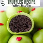 Delightfully festive Grinch Christmas Truffles made with crushed Oreos, creamy whipped cream cheese spread, and coated in vibrant green vanilla almond bark. These fun, bite-sized treats are finished with red heart sprinkles to capture the whimsical spirit of the holiday season.