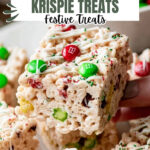 These Holiday Rice Krispie Treats are a festive and delightful twist on the classic dessert, featuring mini marshmallows, holiday M&M's, colorful sprinkles, and a drizzle of white chocolate. Perfect for seasonal celebrations and holiday parties, these treats are easy to make and sure to bring cheer to any occasion.